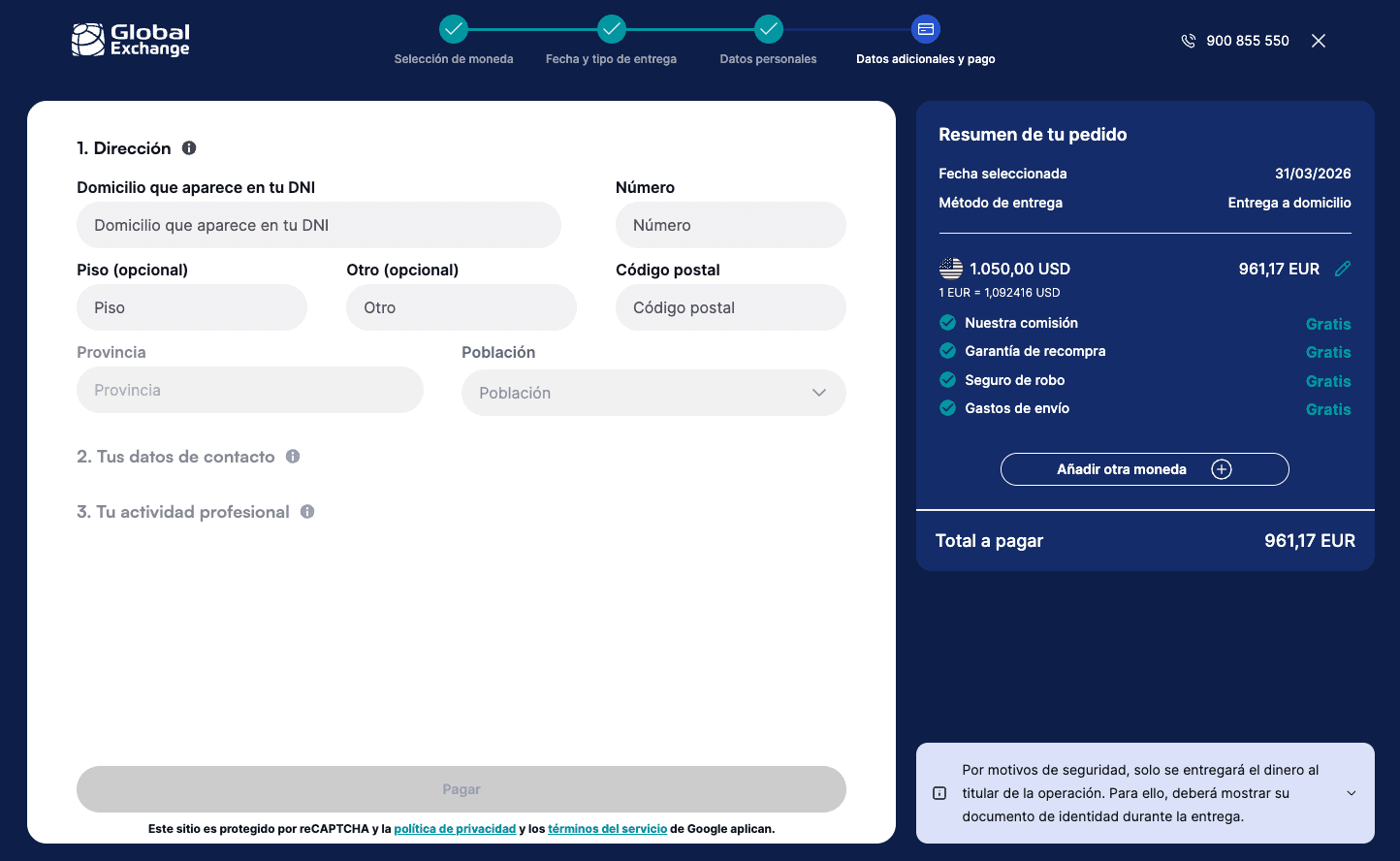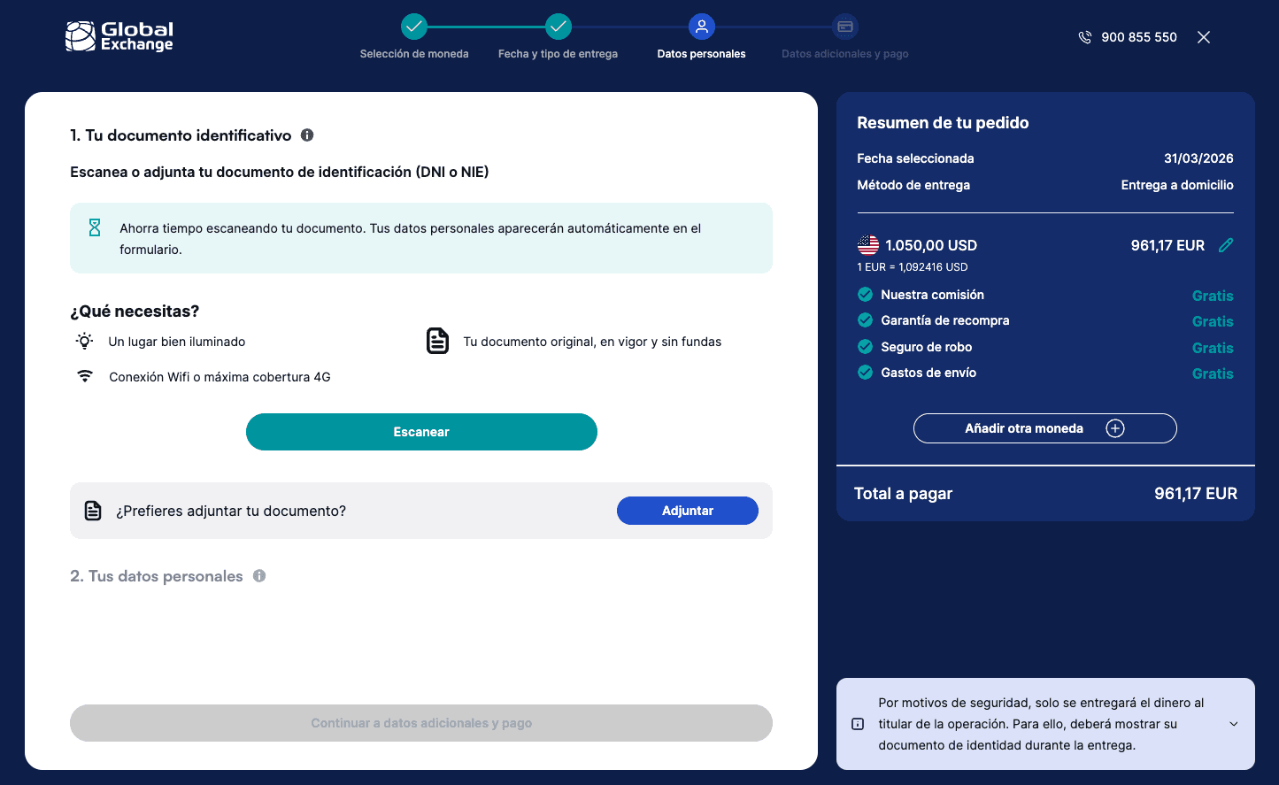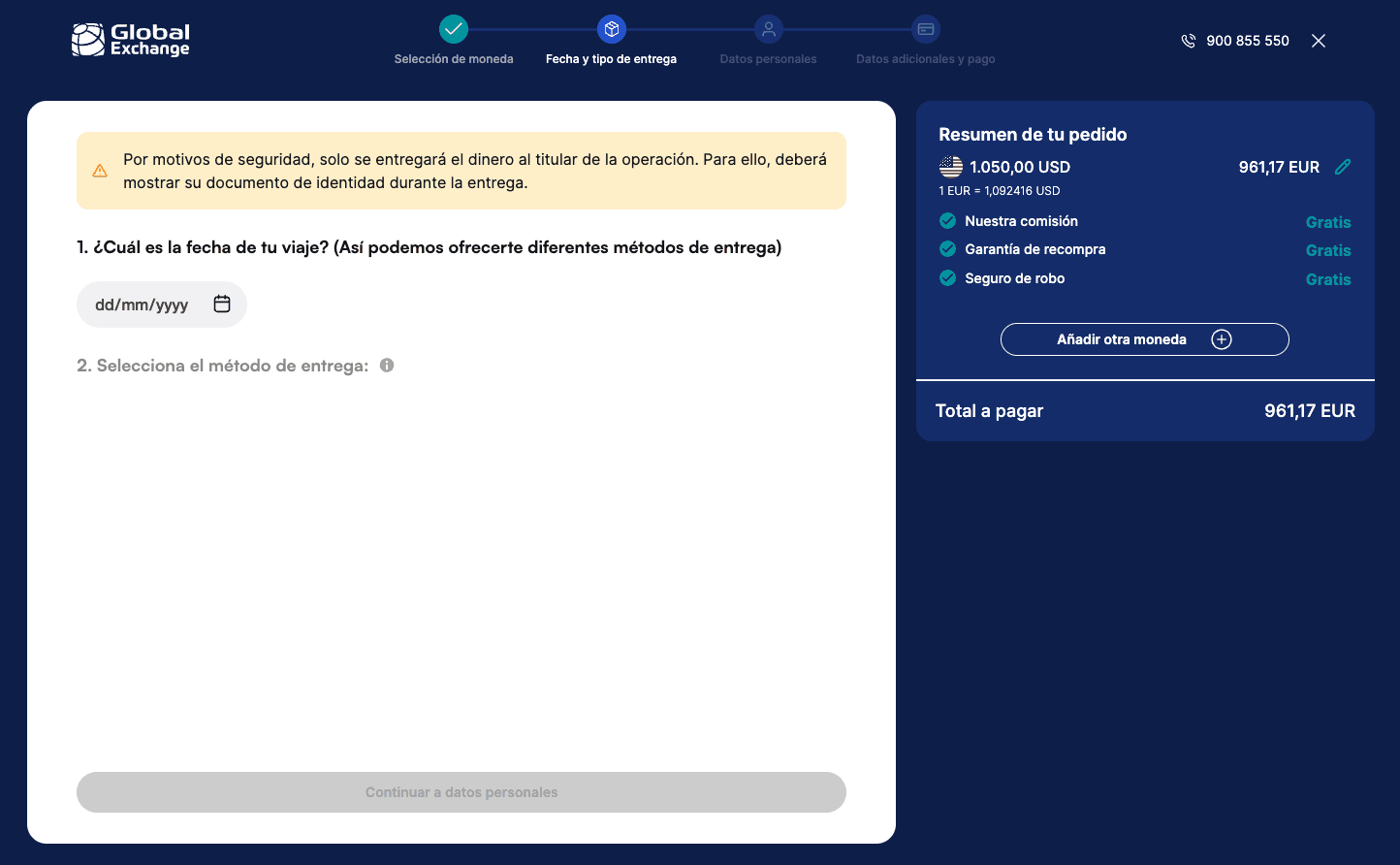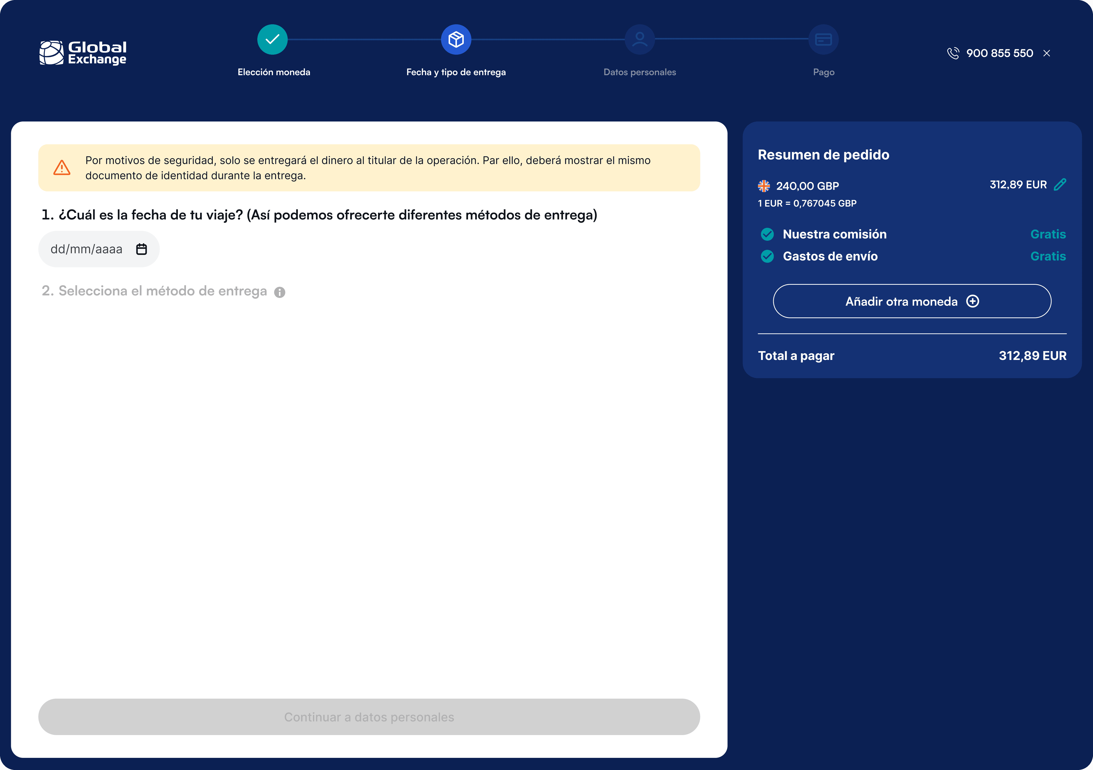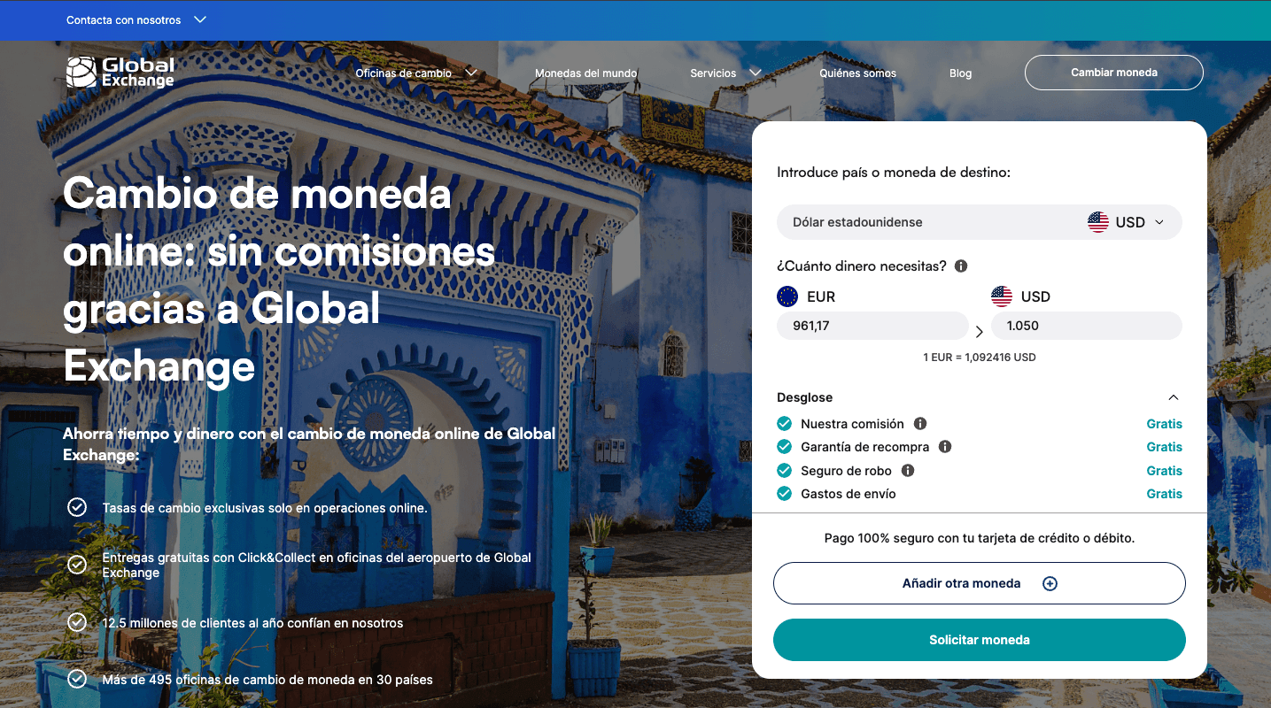 Rediseño del flujo de compra de moneda online para Global Exchange, simplificando el proceso y mejorando la claridad del servicio para los usuarios.
